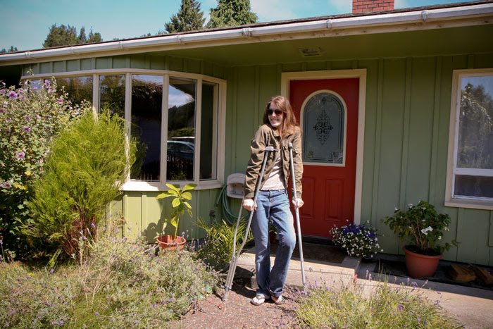 When she wasn’t on crutches Nene rolled around in an automatic scooter that Steven acquired somehow. She has a little scooter course around his house and yard, complete with ramps lined with painter’s tape as visual guides.