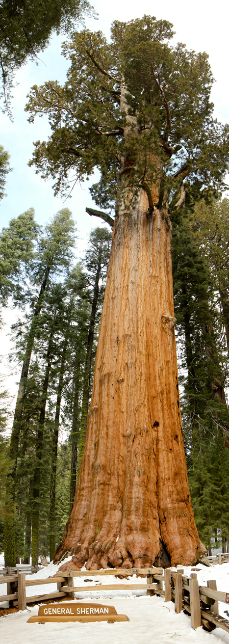 General Sherman. “This tree is not the tallest or the widest, but the overall volume of its trunk makes it the biggest tree on Earth.” Its volume is 52,500 cubic feet, it has a circumference of 103 feet at its base, a diameter of 36.5 feet, it is 275 feet tall, and it weighs 1,385 tons.