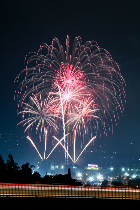 This is Pasadena’s Rose Bowl fireworks show from the Colorado Street bridge.