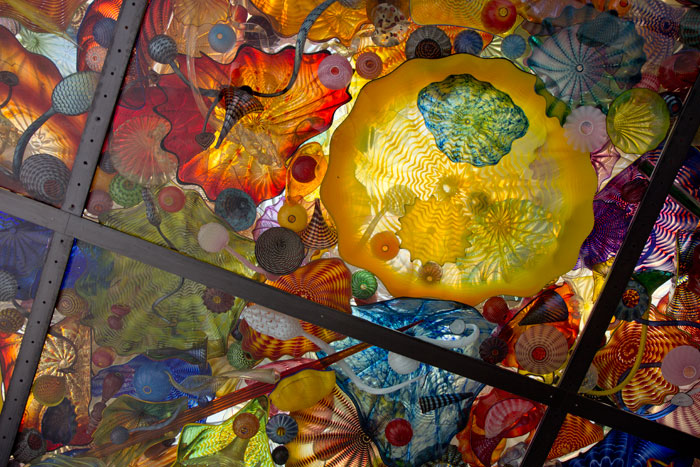 This glass work is in the ceiling of the bridge beside the courthouse.