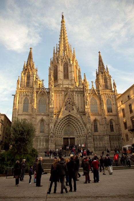 Barcelona Cathedral in the Gothic Quarter, called the Cathedral of the Holy Cross and Saint Eulalia. Thirteen white geese are kept in the nearby cloister because Eulalia was supposedly martyred at age 13.