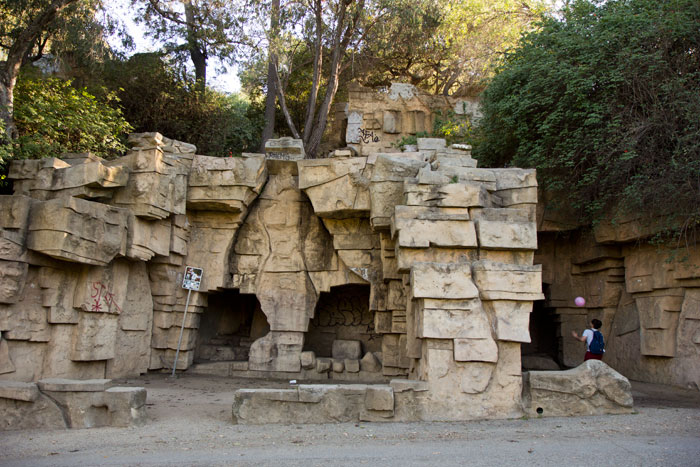 According to the sign: “Site of the Old Los Angeles Zoo. This Griffith Park canyon area served as the City’s Zoo from its founding in 1912 to 1965, when the Los Angeles Zoo moved to its current location about two miles north of where you are currently standing. Many of the walls, grottos, and other enclosures you see today were built in the 1930s by County Relief workers and Works Progress Administration (WPA) crews. Once bears, lions, monkeys, macaws, goats, elephants, reptiles, and turtles, among others, lived here and the sounds of their growls, roars, calls, and clamor filled this canyon. Although these historic enclosures are no longer appropriate for housing animals, they can be home to memories of family visits to the Griffith Park Zoo, as well as an opportunity to better understand developments in the zoological sciences. Please enjoy and respect the buildings, walls, and habitats you will discover today.” (The last line is nearly obscured with graffiti.)