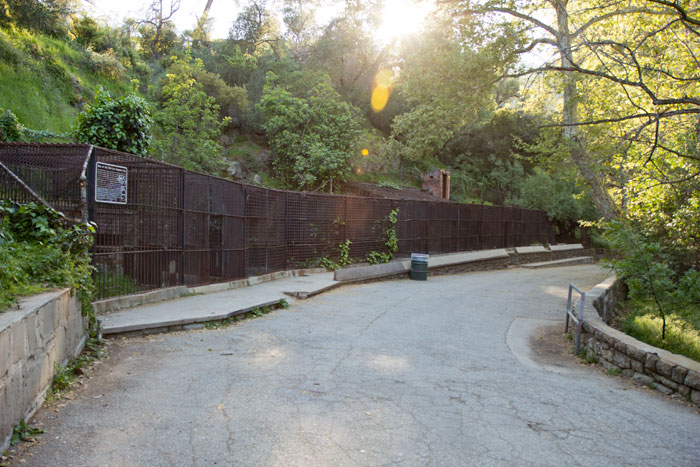 According to the sign: “Site of the Old Los Angeles Zoo. This Griffith Park canyon area served as the City’s Zoo from its founding in 1912 to 1965, when the Los Angeles Zoo moved to its current location about two miles north of where you are currently standing. Many of the walls, grottos, and other enclosures you see today were built in the 1930s by County Relief workers and Works Progress Administration (WPA) crews. Once bears, lions, monkeys, macaws, goats, elephants, reptiles, and turtles, among others, lived here and the sounds of their growls, roars, calls, and clamor filled this canyon. Although these historic enclosures are no longer appropriate for housing animals, they can be home to memories of family visits to the Griffith Park Zoo, as well as an opportunity to better understand developments in the zoological sciences. Please enjoy and respect the buildings, walls, and habitats you will discover today.” (The last line is nearly obscured with graffiti.)