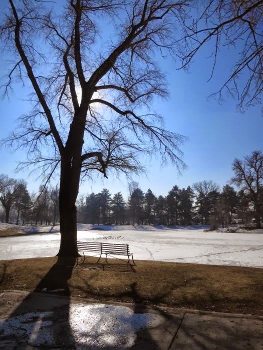 The pond is frozen! And a flock of seagulls have decided to camp out in the middle of it.