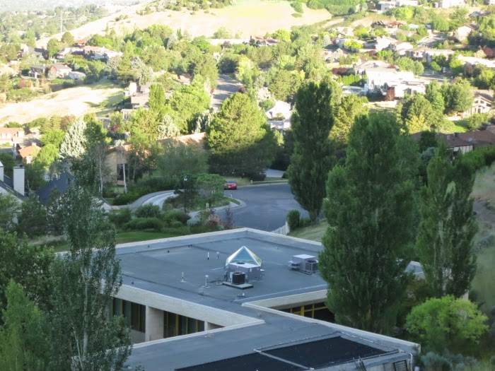 The University stadium in the back-left (with the red seats), and the Merrill Engineering Building (MEB) in the mid-ground (with the big parking lot). MEB contains the computer science department (my advisor’s office) and the wireless controls for the U’s 240 red and white lights.