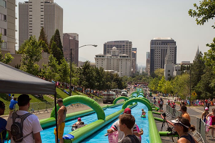 So Slide the City came to Salt Lake City today. It is a 1,000-foot slip-n-slide that runs down two blocks of Main Street from the capitol building to Temple Square. A giant beach ball is sitting in the 75-foot stopping pool at the bottom.