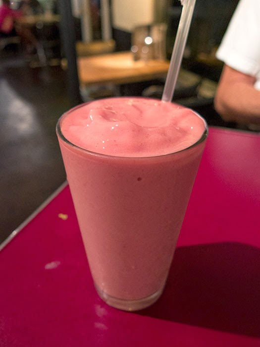 The pink flamingo smoothie (orange juice, strawberries, and banana).