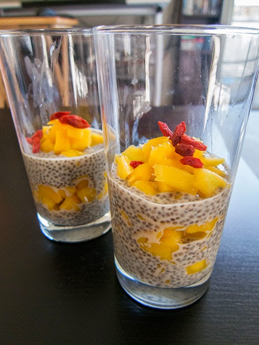 Mango chia seed parfait for breakfast (garnished with goji berries).