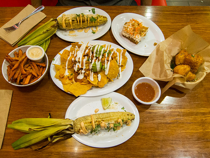 At the Veggie Grill in Westlake Village on the way home. We created an appetizer feast for fear that the seasonal corn might soon disappear from the menu.