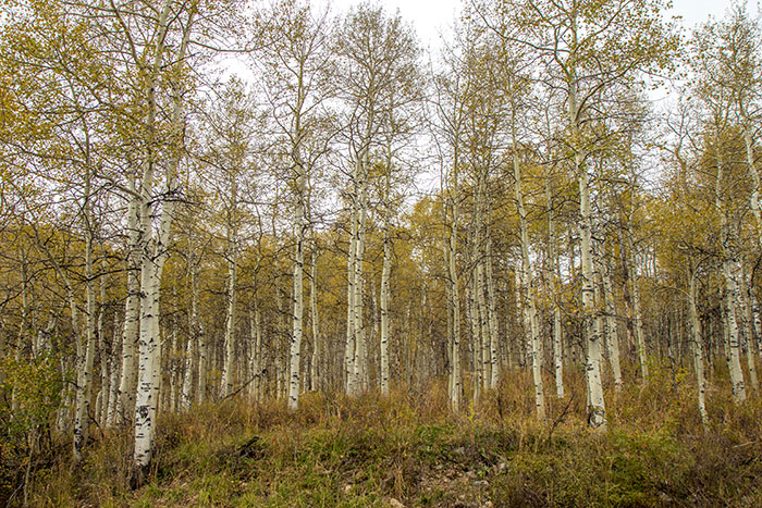 The odd climate conditions turned the aspen bark a subtle shade of green.