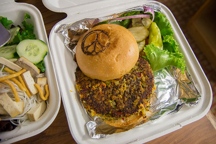 Back in Moab, we wandered town looking for vegan food, and we were rewarded beyond our wildest imaginings by the Peace Tree Cafe. The cashier was vegan, too, and took good care of us. And the food was amazing. We got the quinoa veggie burger, the Thai salad, and the sweet and salty beet salad.