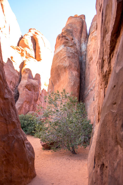 Leaving Sand Arch. This area was nice because it was shaded and cool and had some nice greenery next to the pink rocks.