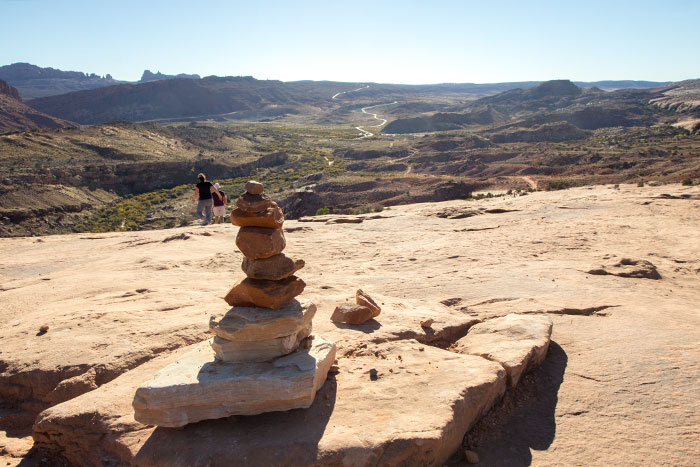 Part of the three-mile-round-trip hike to Delicate Arch is marked by these rock piles, since the trail meanders up bare sandstone.