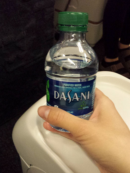 Ultimately no one came to sit in the seat next to me, so I drank both our Dasani water bottles. (They have them sitting on the arm rest when you board the plane.)
