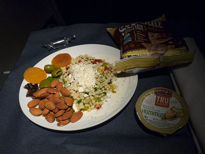 The first class flight attendant comes by and takes your dinner order. When she found out I was vegetarian she said she could create a meal for me. It was couscous salad with a delicious collection of sides and a chocolate for dessert. I forgot how enjoyable a flight can be when a meal is involved.