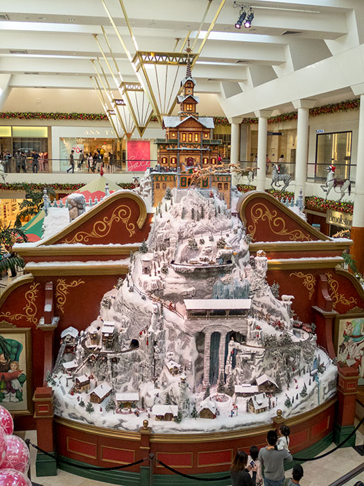 The mini village (complete with running train and smoking chimneys) behind the Santa photo op.