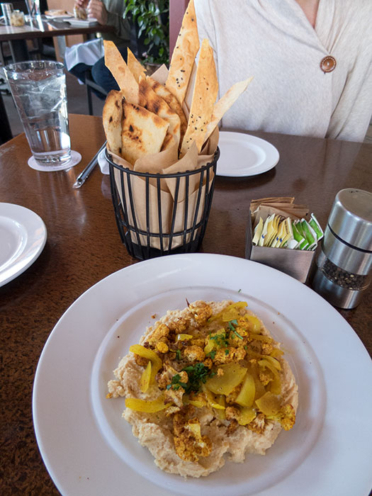 Our Mediterranean hummus appetizer with roasted cauliflower and onions.