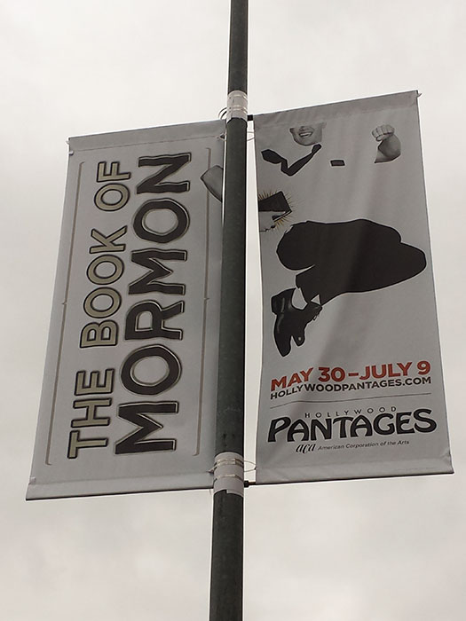 Banners line Hollywood Blvd. for whatever is coming up at Pantages. The Book of Mormon is better than I thought possible, and I had the soundtrack memorized by the time I saw it live.