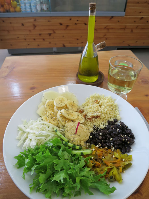 But since the pasta had cream sauce, they made me an amazing salad instead. There was couscous with chopped dates, black beans with crispy rice, pickled vegetables, lettuce, cabbage, cucumbers and hummus, and pears, bananas, and chia seeds.