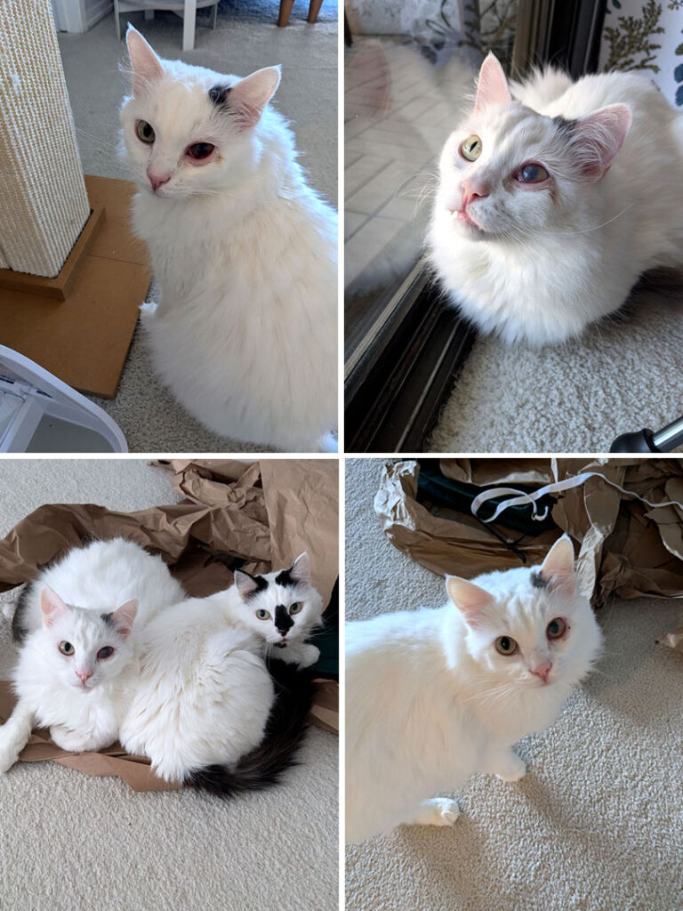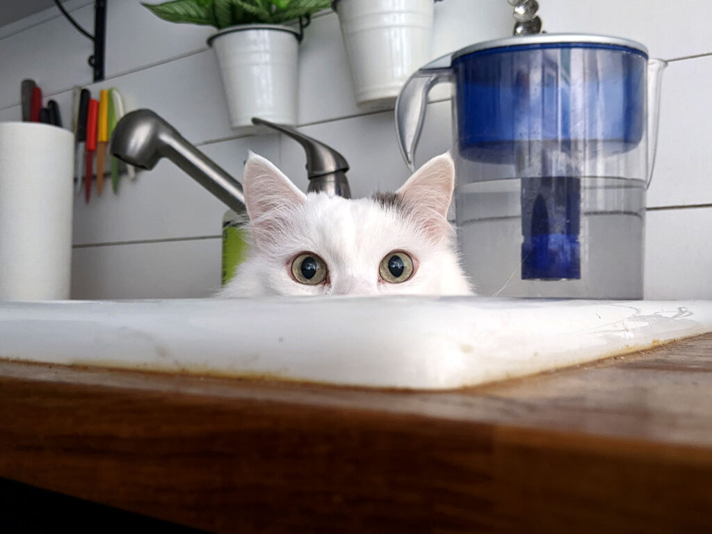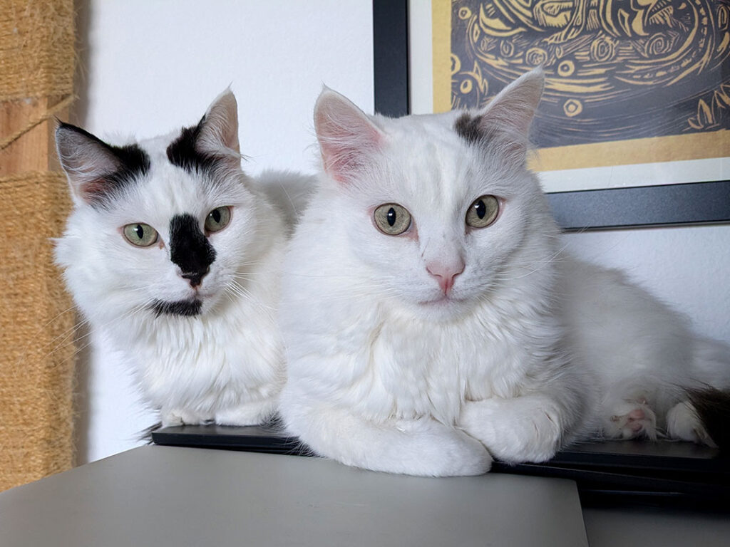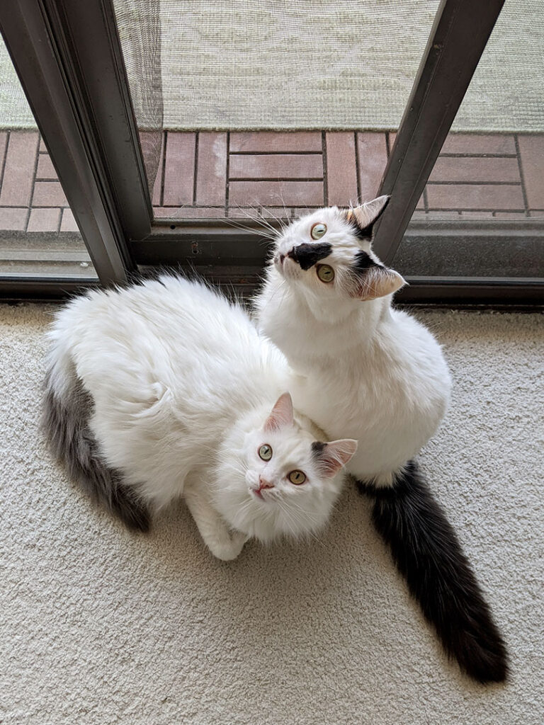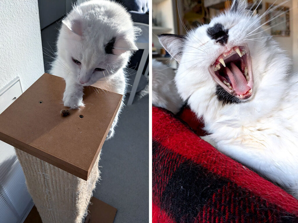 The problem? The feeders work SOME of the time, but not ALL the time. RFID technology is finicky. Is there metal nearby? Or anything electric? The feeder won’t behave as expected. Is there a difference in chip and reader frequency? Is the chip the wrong type? Did the chip migrate to somewhere else inside the cat? The feeder won’t behave as expected. (Does this condo have a space without anything metal or electronic? No, no it does not.) I encountered some unbelievably frustrating things about cat care over the next few months, but for some reason nothing created anxiety the way the unreliable microchip feeders did. At first I thought my feeders were faulty. Violet’s feeder would close randomly while she was eating, and Hugo’s feeder often wouldn’t open at all. I exchanged those feeders only to see the exact same behavior in the new feeders: Violet’s closes, Hugo’s won’t open. So I started working with the company to troubleshoot. After a couple rounds of me sending them these heartbreaking videos of Hugo leaning over his closed feeder looking up for help and them sending button combinations to put the feeder into different modes, they sent a range tester to see if the problem was the feeder sensors. The range tester proved that the feeders worked GREAT, EVERY TIME, and at LONG DISTANCES, the opposite of the way the feeders behaved with the cats. I felt insane. The only way to troubleshoot an issue is to figure out a way to reliably reproduce the problem, and the feeder behavior was consistently unpredictable. Finally I realized the problem was THE OTHER FEEDER. You can’t have them too close to each other (like in these photos). I checked my “other feeder” theory with the company after all our back-and-forth had come to naught, and they said, “Oh. Yeah. By the way, make sure the feeders aren’t next to each other.” So I put the ceramic water dish between the feeders, and now they work most of the time. Hugo’s feeder still doesn’t open sometimes, but it opens often enough that I don’t feel the need to hang around to open it for him anymore. (He’s also gotten good at figuring out how to approach the feeder at different angles until it opens. He starts head-on and if that doesn’t work he backs up, takes a step to the left, then comes in from the side, and that usually does it.) Violet’s feeder will close on her only if the feeder gets too close to the wall behind (you can see there’s a metal grate there). It’s still not as reliable as I’d like, but it’s enough that I feel the cats can be alone for a day.