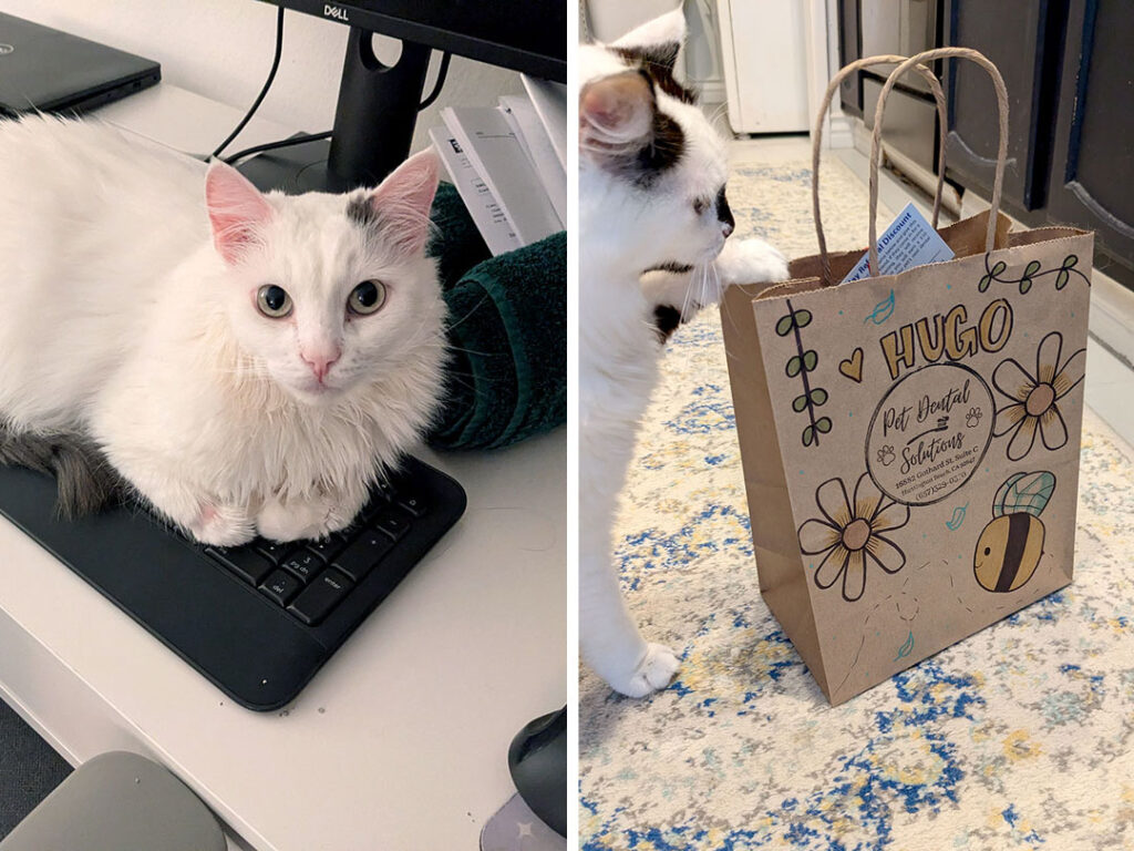 Pet Dental Solutions took good care of Hugo for his surgery. They have you drop the cat off in the morning, then they call you once he’s under anesthesia, then they call you again once his surgery is over and let you know what time to pick him up. The photos above are of post-op Hugo (you can see his wrists are shaved for the IVs), and the bag Pet Dental Solutions made for Hugo’s post-op care. The bag has his pain meds (Gabapentin) and his anti-inflammatory/pain meds (Onsior) and some goodies like a toothbrush and mouth rise. When I picked Hugo up, they had me meet a member of the surgery team in the consult room for a report on the surgery. He had a laptop so we could look at Hugo’s x-rays. Cats have 30 teeth, and Hugo needed 24 extracted. Basically if the tooth moves or wiggles the surgery team will cross-references that with the x-ray to decide whether to pull a tooth or not. Hugo’s x-rays showed a lot of ghostly teeth roots, like the teeth had been dissolved and only the faintest outline remained. So that question from earlier, about why the dental treats weren’t doing anything? It turns out both cats have stomatitis, which is like an autoimmune disease where your body attacks your teeth and dissolves them. Modern medicine doesn’t know a lot about stomatitis in cats or why it happens or what causes it. The surgery team member said it seemed to be happening more often, and that it was affecting a lot of dogs now as well as cats. His (self-admittedly uneducated and unfounded) opinion was that it seemed to coincided with the rise of the grain-free trend in pet food. (And I had indeed been feeding my cats a brand of food that happened to be grain-free. I doubt there’s any research to support the grain-free theory at the moment, but give it a few years and maybe something will become obvious.) The other theory was that stomatitis is genetic and the cats got it from their parents. The surgery team member also believed that brushing the cats’ teeth this whole time wouldn’t have made a difference–the only treatment for stomatitis currently is to pull the cat’s teeth, so we still would have ended up with both cats needing surgery. So it’s good that Hugo got all his teeth pulled at once rather than having to do multiple surgeries over the years, and it’s possible that he’ll need another surgery in the future because he still has six teeth that could start to dissolve. Dissolving teeth is also why you take the cat to a dental specialist–there’s tons of little tooth fragments floating around, and they need to scrutinize the x-rays and make sure they get every sliver. Leaving any tooth bits can cause problems that can lead to more surgery.