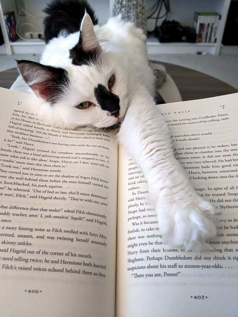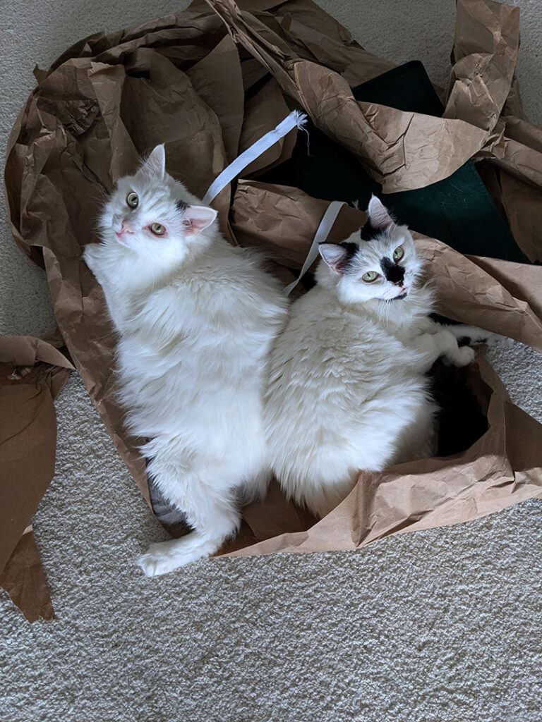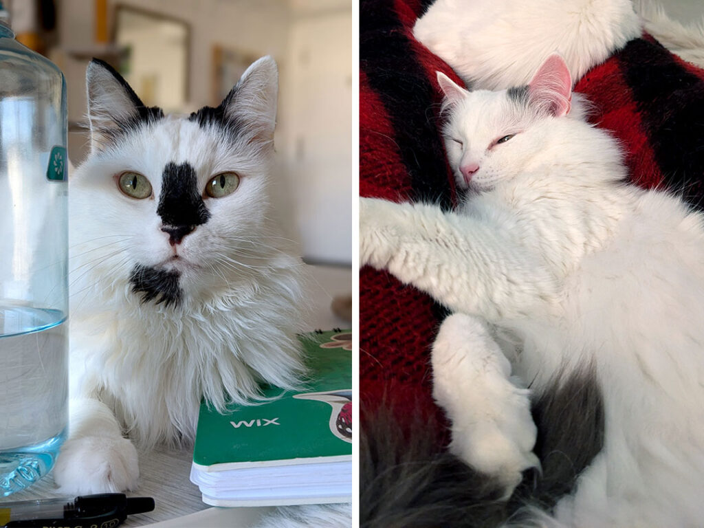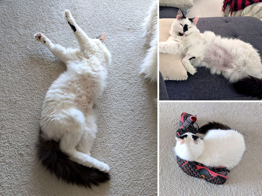 Violet’s updates were good for the next few days. She finally had surgery Wednesday evening. Dr. Pike called when she was going into surgery and about two hours later when she got out. (He opened the call with “You guys have really been through it this year, it’s incredible.”) They’d found and removed four stones. The only issue was that her bladder was so inflamed that it bled even if you touched it. And that can form blood clots which can also block her. So she went back on the catheter until her urine stopped showing signs of blood. It looked good Friday morning so they removed the catheter and waited to see if she was peeing okay without it, and she was! So I got to take her home Friday night. She was so happy to be home after being hospitalized with a catheter for a week. On the trip home she wasn’t moving around in her carrier very much until she heard me unlock the door to the condo, and then she got excited. She started trying to break out of her carrier, then once I let her out she ran around and checked on all the things–her food dish, her water dish, her water fountain, Hugo’s food dish, the litter box, the hallway, the pillows, the cupboards–it was like in Monsters, Inc. when Boo finally gets back to her bedroom and is so excited to show everything to Sully. Next Violet dove head-first into the food dish, then drank a lot of water, then peed and pooped (which are four out of four things I’m supposed to watch for as signs that she’s doing well post-op). Most exciting to me is that she’s so good at peeing now. I assumed she’d at least have cystitis after everything that’s happened, but she hasn’t been taking trips to the litter box when she doesn’t really have to pee.