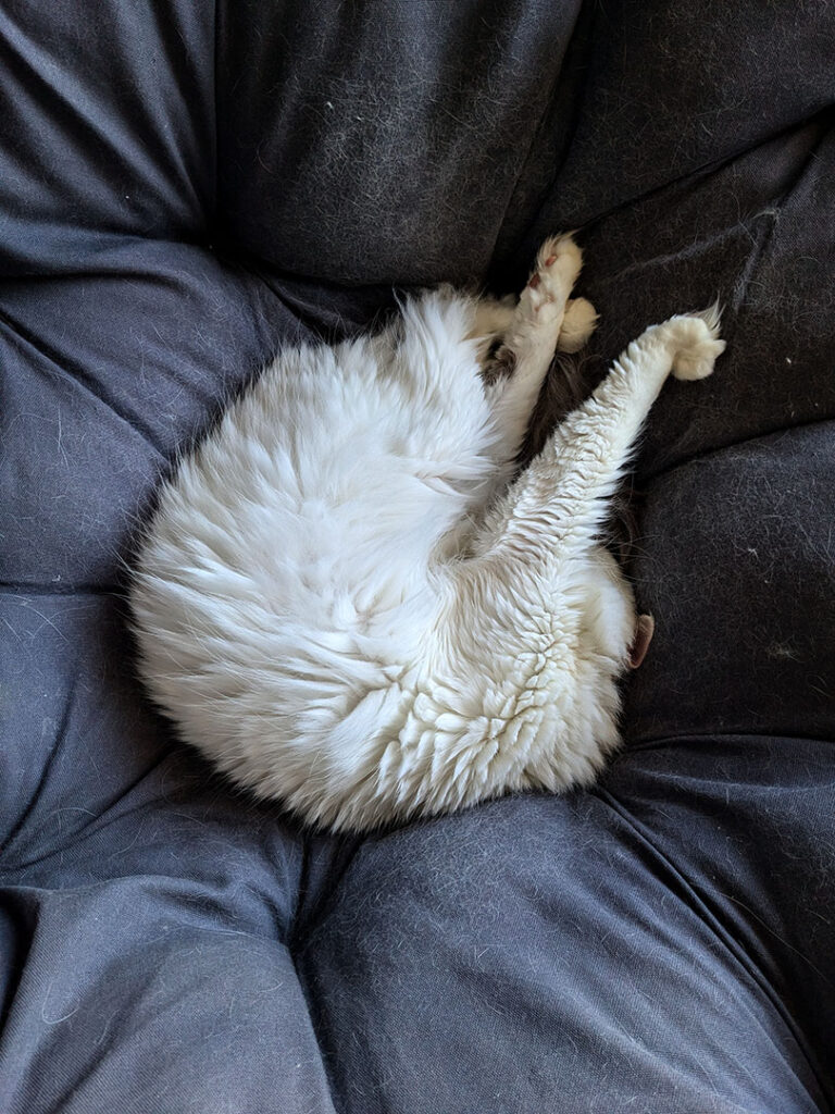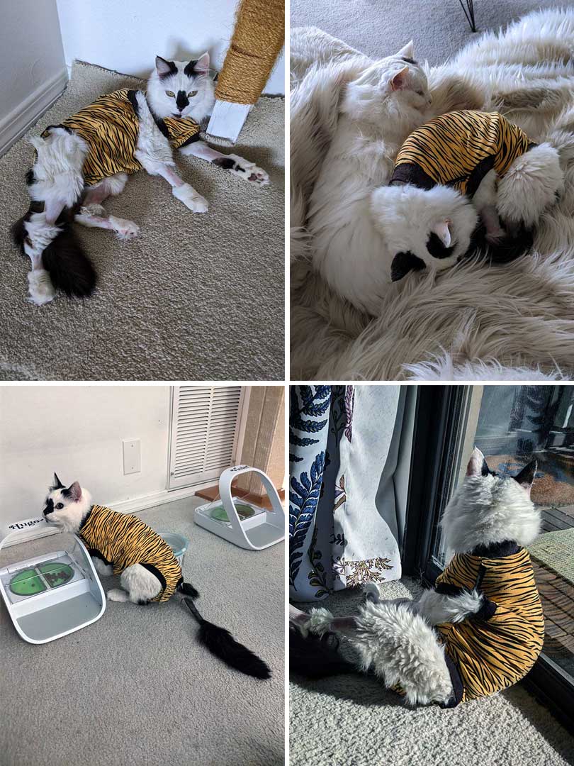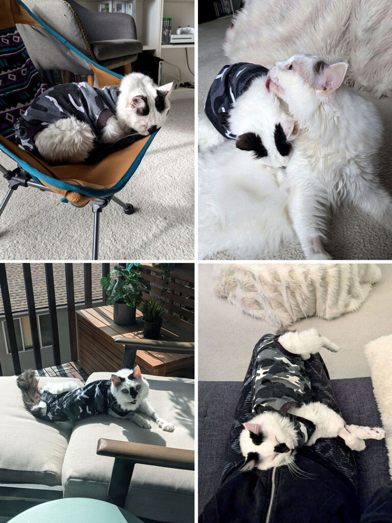 So I got to weigh Violet’s mental health after being locked in a room or a playpen for two weeks versus the chances that she’d try to play and jump when her body was telling her to rest and recover. It was a chance to practice trusting my gut. (I would run into this later with Hugo and cones. Hugo is so sedentary that he won’t bother the affected area, and I knew that and tried to tell the doctor that. But they just know to prescribe constant long-term cone use. I went with my gut and removed his cone all the times they prescribed it. And I felt guilty each time. But Hugo did indeed not bother the affected area even with the cone off, and his mental health was better because he was able to sleep, eat, and move normally.) It’s tricky because you’ll be both wrong and right. Like letting Violet out in the car is not recommended, and it did decrease her anxiety, but you could argue that I got lucky that there was no car accident. Similarly, I was right and wrong with Violet’s post-op jumping. I was wrong in that she did attempt a jump, almost immediately when we got home, but I was right in that she didn’t try jumping after that. I ended up compromising by closing the bathroom door (Violet likes to jump onto the sink), but letting her roam the living room/kitchen as usual. Was that the best choice? No idea.