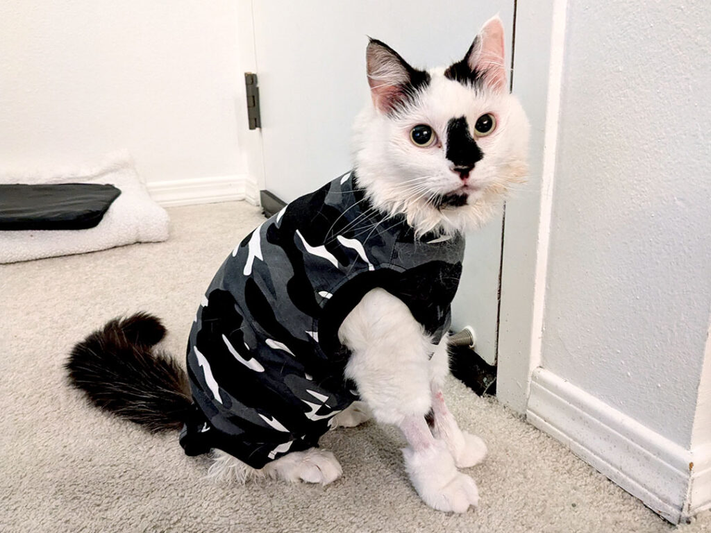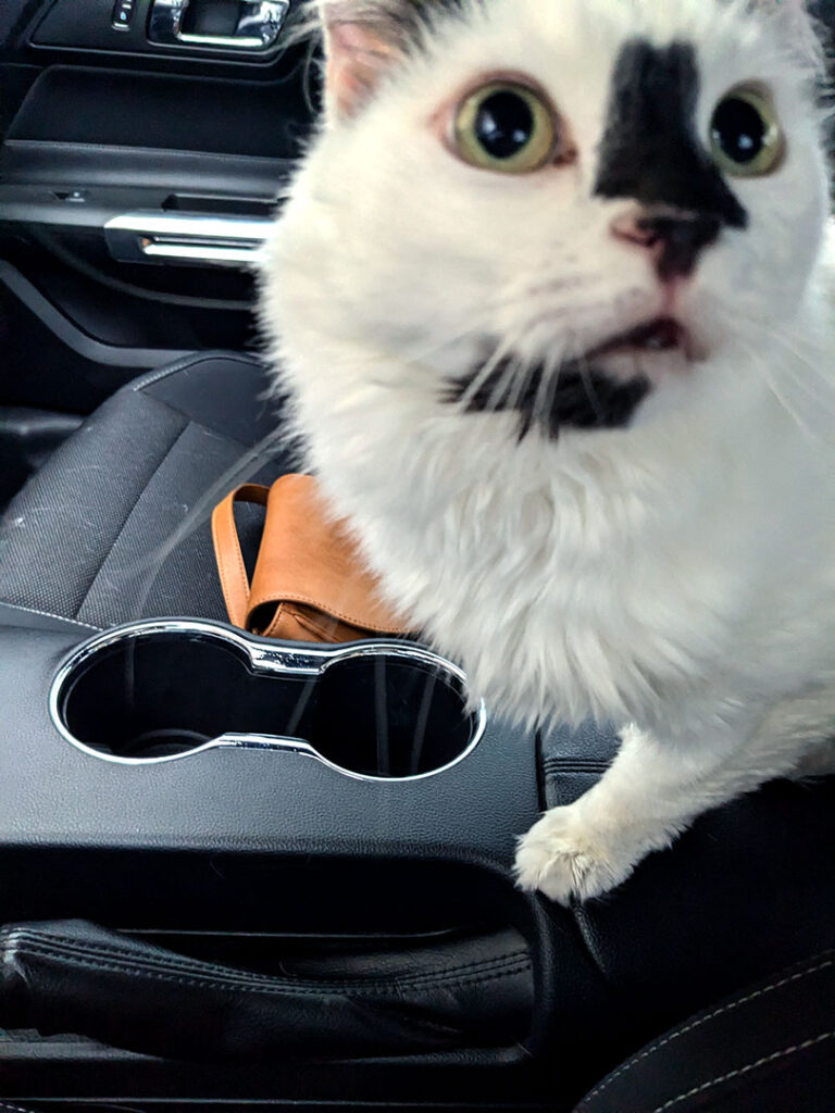 So I bought some surgical recovery pajamas for Violet, packed her food and her meds into her backpack, and dropped her off for surgery. The photo above is blurry, but I love it. I took it in the parking lot just before we went inside for drop off. You’re not supposed to let the cat wander the car while you’re driving, but I’d let her out at the Aliso Creek rest stop so she could see something other than the inside of her cat carrier backpack for the rest of the drive. I took the picture just in case I didn’t get to see her again.