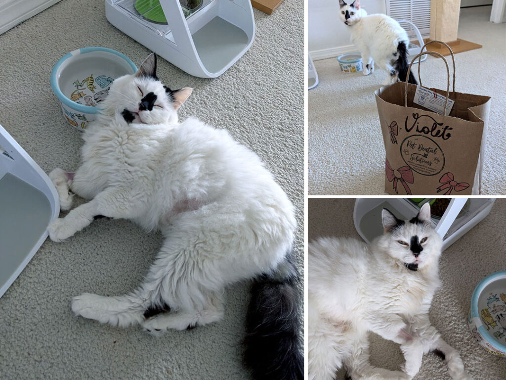 So had the dental treats done nothing? (More on that later.) Fortunately Dr. Tran had a great bedside manner and made space for my “wait, what?!” response, which was a blend of guilty “Should I have been getting their teeth cleaned this whole time,” and confused “How did her teeth get so bad since 2023, I’ve been doing the dental treats, she’s only five years old, and I’ve never had a cat get dental disease before.” Dr. Tran explained that it’s hard to tell with cats, that cats are great at hiding their pain, and that stuff like this can often be genetic so you just get lucky or you don’t. Unfortunately, I’d caught Dr. Tran on her last week at that office, so she needed to transfer Violet’s case to the doctor who was going to be there long enough to get the dental surgery done. She recommended a blood-draw for Violet to rule out any underlying causes, and then I could make a second appointment to meet the other doctor and get the bloodwork lab results.